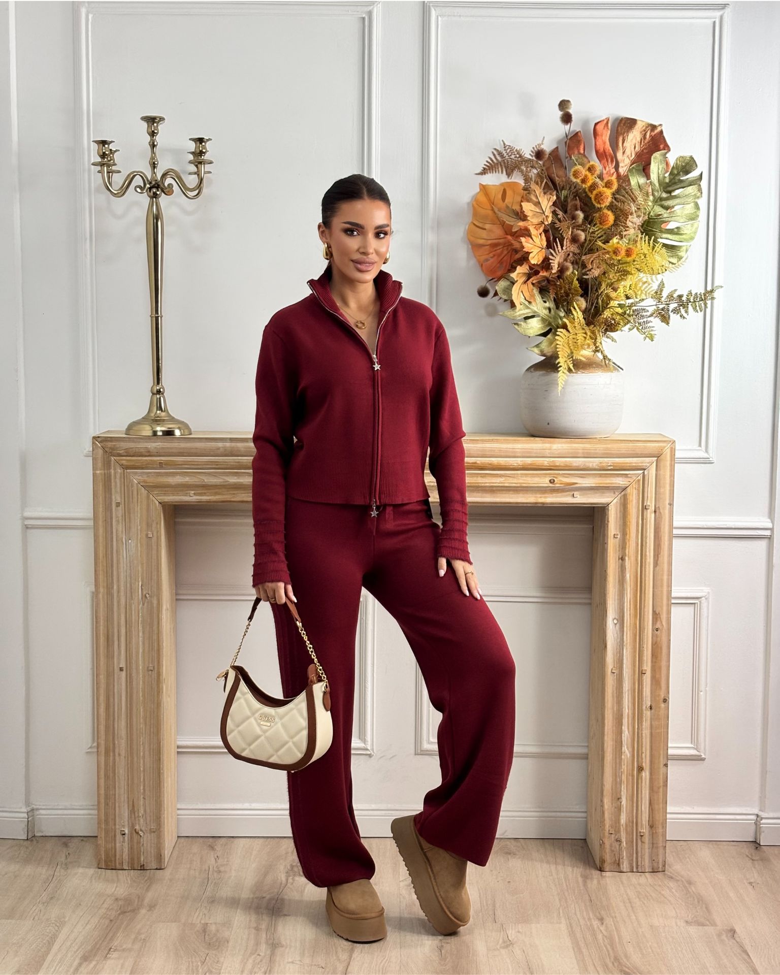 Bordo trikotažna trenerka postavljenog modela koji kombinuje udobnost i moderan izgled. Sastoji se od pantalona šireg kroja koje omogućavaju slobodu pokreta i gornjeg dela sa rajsferšlusom koji olakšava oblačenje. Mekana postava pruža prijatan osećaj i toplotu tokom hladnijih dana, dok kvalitetan materijal od viskoze, poliestera i akrila obezbeđuje trajnost i udobnost. Idealna za svakodnevne aktivnosti i ležerne modne kombinacije.