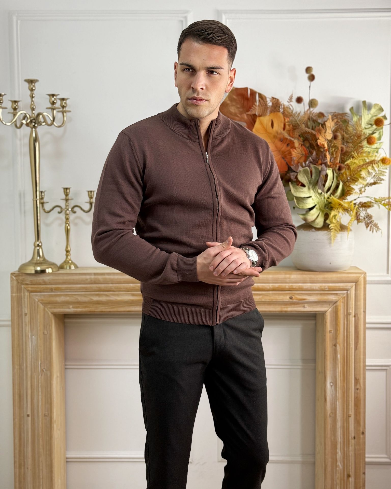Muški braon džemper sa rajsferšlusom koji se kopča celom dužinom, praktičan i udoban za svakodnevno nošenje. Klasičan dizajn omogućava lako uklapanje uz različite stilove.