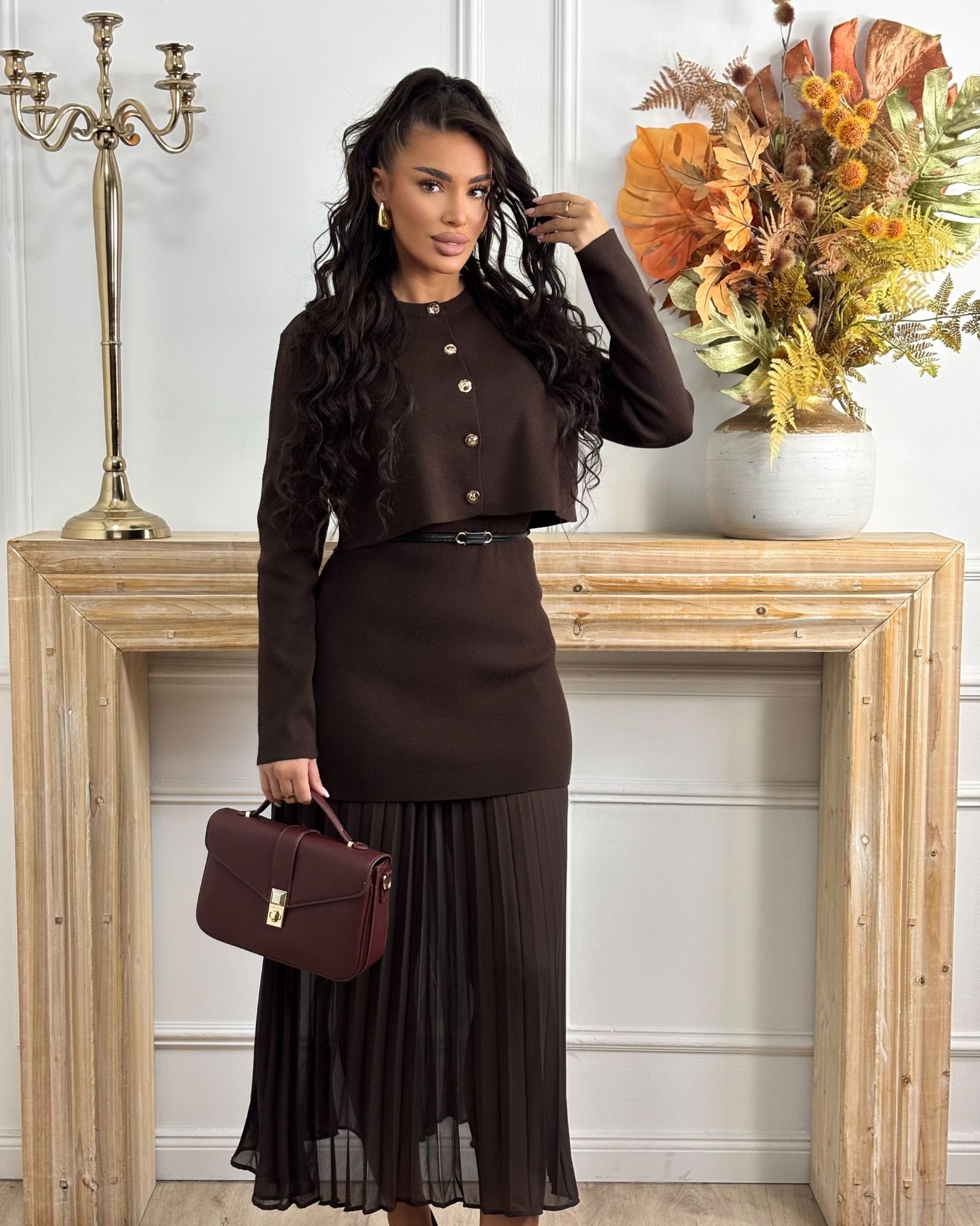 Stilizovan braon trikotažni komplet koji spaja udobnost i eleganciju. Sastoji se od haljine sa plisiranim donjim delom od lepršavog materijala koja daje lagan i ženstven izgled, i džempera na kopčanje sa zlatnim dugmetima za sofisticiran detalj.