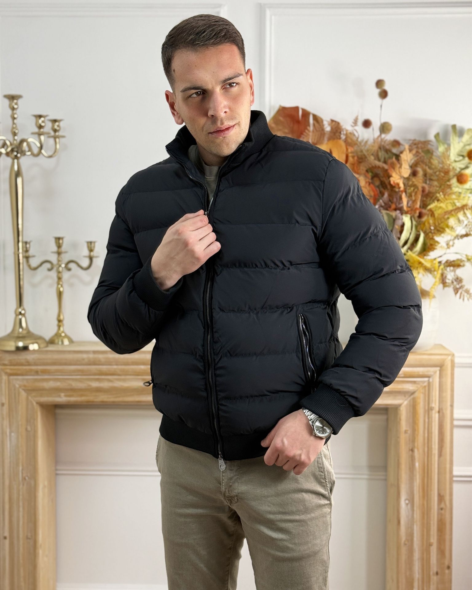 Muška crna jakna sa ranflom, uključujući i kragnu, klasičnog i udobnog kroja, idealna za svakodnevno nošenje.