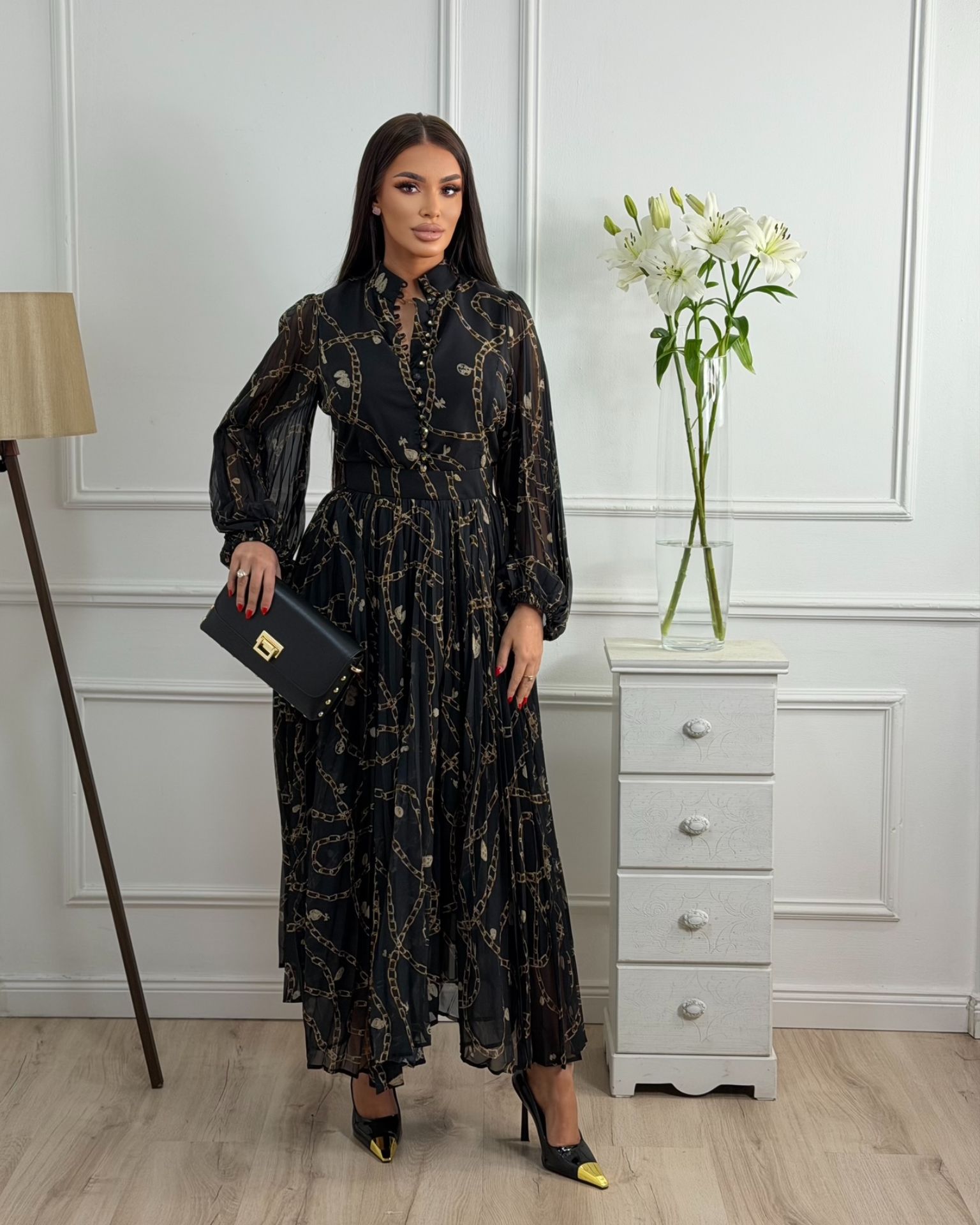 - Detalji: plisirana suknja, til rukavi