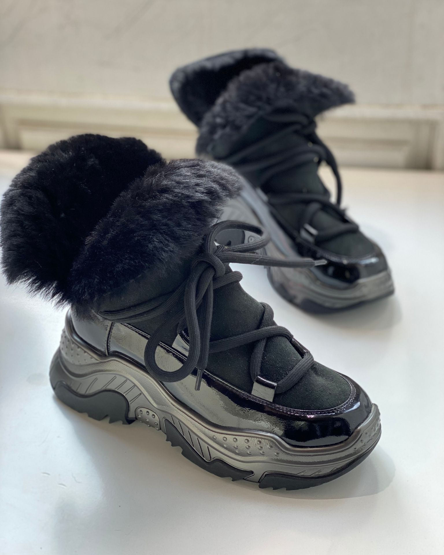 Crne patike izrađene od kombinacije kože i lakirane kože sa unutrašnjim postavom od prirodnog krzna, koje pruža dodatnu toplinu i udobnost. Moderna kombinacija materijala daje sofisticiran i urban izgled, dok anatomski oblik patike omogućava lakoću kretanja i stabilnost tokom celog dana. Savršen izbor za stylish dnevne kombinacije u hladnijim mesecima.