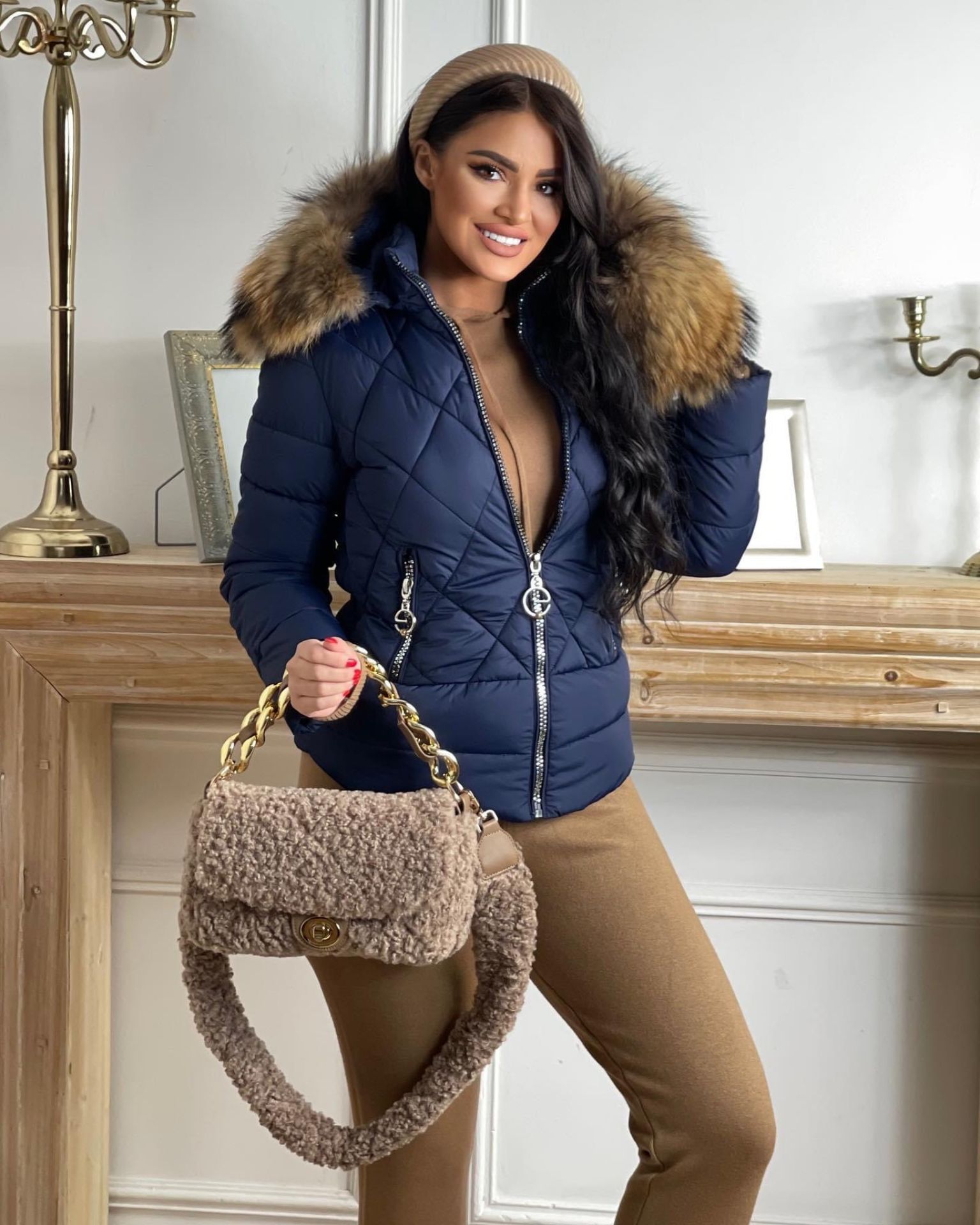 Elegantna teget zimska jakna dužine do kukova koja pruža savršen spoj topline, funkcionalnosti i luksuznog izgleda. Silikonsko punjenje obezbeđuje odličnu termoizolaciju i udobnost tokom hladnih dana, dok kapuljača ukrašena raskošnim krznom polarne lisice daje sofisticiran i upečatljiv izgled. Ovaj model je idealan izbor za zimu kada želite praktičnu, ali istovremeno elegantnu jaknu.